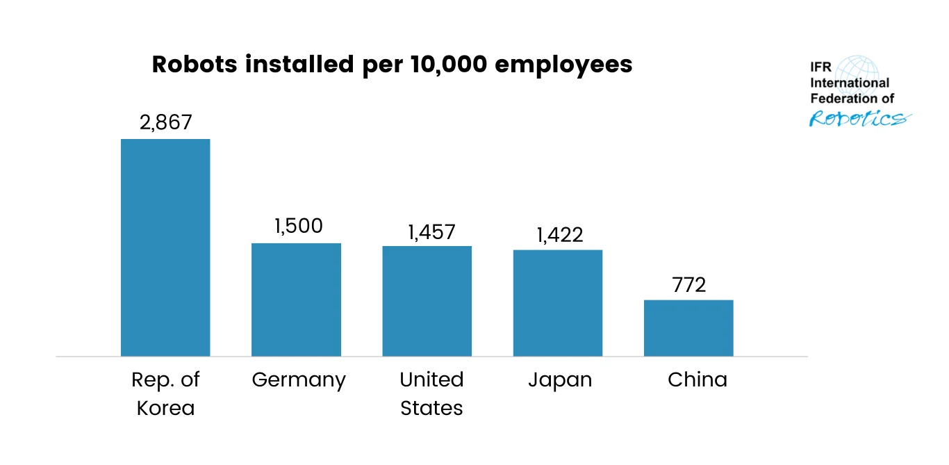 Observation of the law: Tesla's utilization of automation in its manufacturing process showcases the power of robotics. Automated assembly lines enable Tesla to produce electric vehicles efficiently, meeting growing demand. Another example from the auto industry is an entire country — China. As the largest car manufacturer in the world, it has a robot density of 772 units. However, it is rapidly catching up with the rest of the world. In 2021, new robot installations in the Chinese automotive industry nearly doubled to 61,598 units, accounting for 52% of the total 119,405 units installed in factories worldwide.
