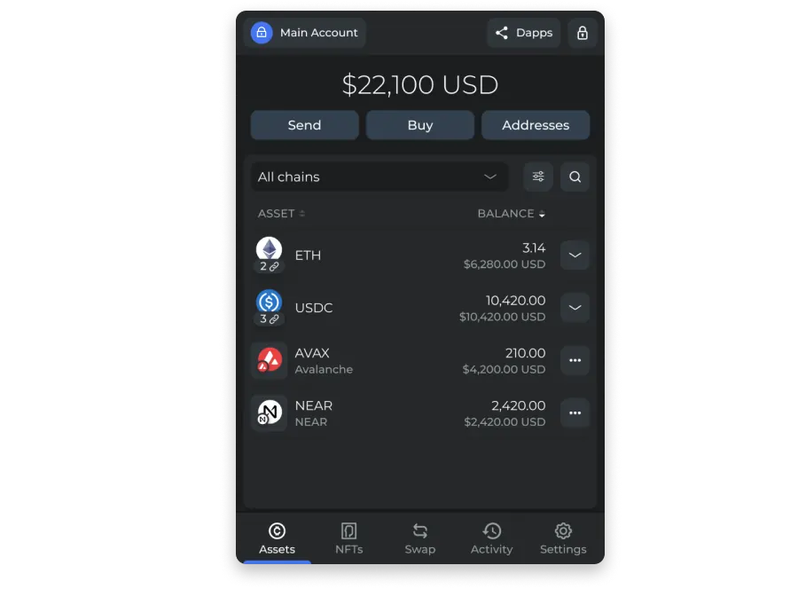 DeFi is a multichain wallet that allows users to securely swap, store, and send crypto and NFTs across 20 blockchains, including Bitcoin, Ethereum, Fantom, Arbitrum, Avalanche, and others. As a leading DeFi wallet development project, the product has been designed as a browser extension available on Google Chrome, Microsoft Edge, Opera, Brave, and Côc Côc Browser.