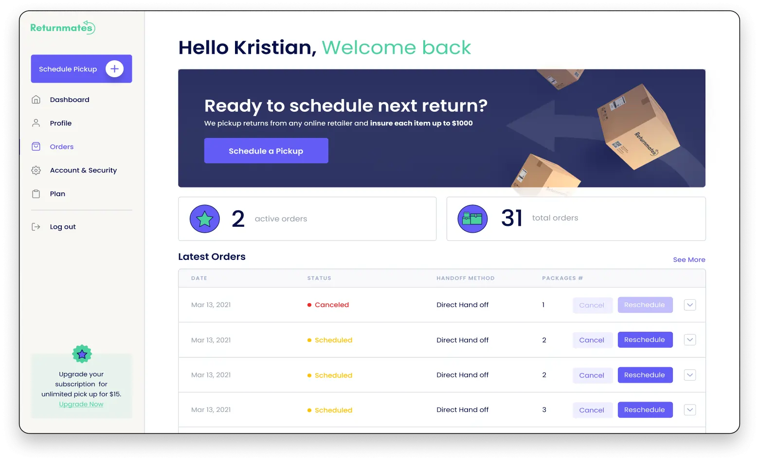 Returnmates is a user-friendly platform that is changing the way businesses and consumers handle returns. It radically streamlines the return process for online shoppers and improves their overall buying experience by enabling them to return purchases without leaving the comfort of their homes. Customers can schedule return pickups without worrying about the associated hassles such as label printing or packaging.